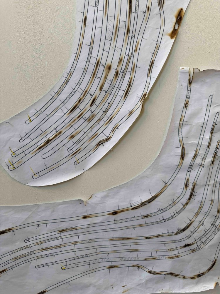 Each installation is a record of its own making. Every hand-bent tube retains the memory of the flame. Hand-painted surfaces hold brush marks, fingerprints, and dust, etc. Packaging bears the evidence of transport: chipped areas, broken segments, repairs… Even the hardware accumulates history. Terre, for example, has already been installed in three different places; it still carries elements from its first version at Braziers Park in Oxford, alongside revisions that only exist because the work has travelled.