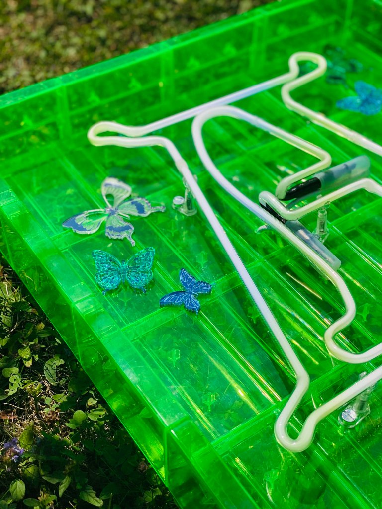 The choice of neon green cassette tapes is also based on Amelie’s favourite colour green and blue 💚💙 and as a resemblance to a forgotten form of music 🎵, similar to how neon is being forgotten as a fading artisanal craft.