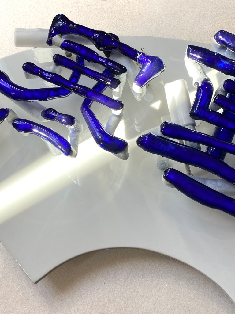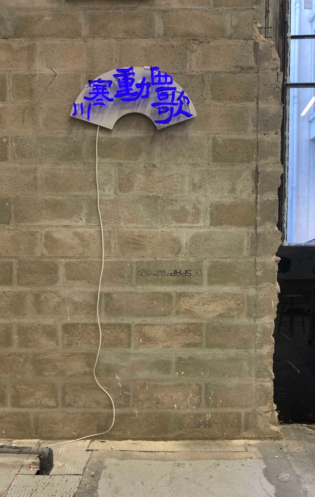 🤲 L’œuvre reflète le lien entre les mains et la création : les poèmes et la calligraphie chinoise qui nécessitent nos mains pour être écrits, le néon qui se plie sous nos gestes, le verre peint à la main avec du bleu cobalt, et l’éventail en porcelaine de Limoges façonné à la main par CRAFT Limoges.