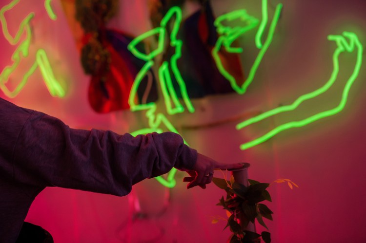 “Shhh (樹)” explores the invisible force of strong wind in nature. It is an interactive embroidery neon installation that responds to the broken trees damaged from the typhoon Mangkhut.