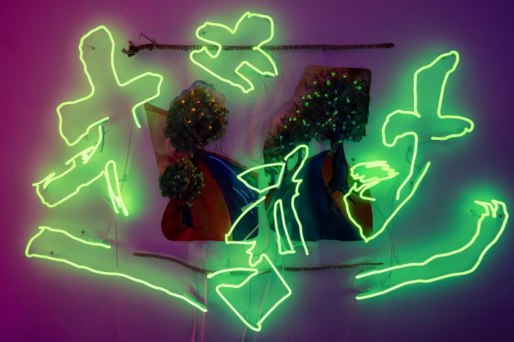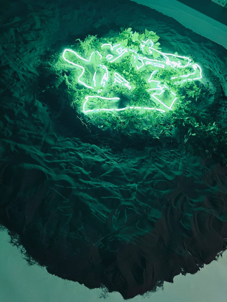 The use of neon light in the Chinese character “Tree” written in Clerical script and LED neon light strips for the leaves on the work is my attempt to provoke a visual dialogue between tradition and modernity to us.
